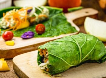 This creative take on a wrap uses fresh, raw green leaves in place of a tortilla along with ingredients you might already have on hand for a seasonal, whole food boost to your day. Feel free to substitute any vegetables you have on hand that sound good!