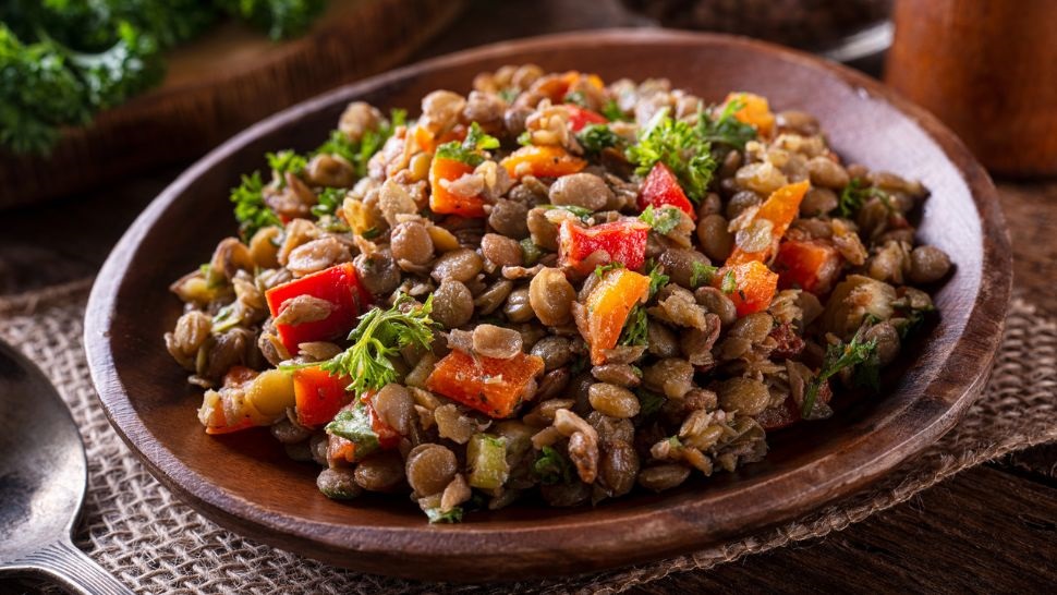 Toss lentils with vinaigrette and chopped thyme. Serve warm or at room temperature garnished with thyme sprig.