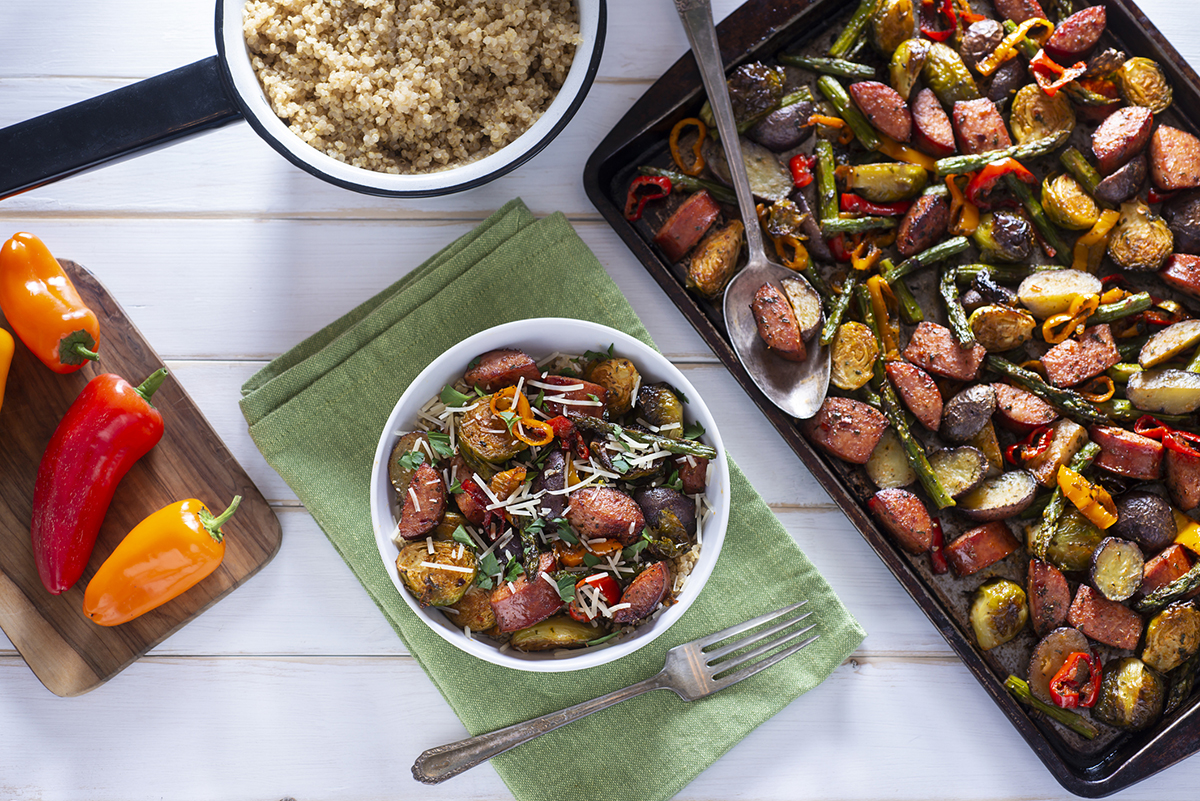 - Add protein to round out the meal. While the vegetables are the star of sheet pan dinners, including a plant- or animal-based protein will make it nutritionally complete. Whether you choose tofu, tempeh, poultry, fish, or beef, plan for about 2 to 4 ounces per serving, and keep in mind that some proteins need longer to reach a safe temperature.