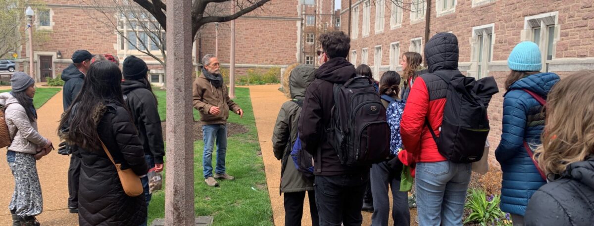 Attended by over 20 students, faculty, and staff, the tour began on WashU’s Brookings Quad, and meandered across campus, with Professor Braude identifying edible flowering trees like redbud, whitebud, magnolia and linden. Unassuming sprouts, like lambs quarter, dandelion, wood sorrel, and chicory were shown by Professor Braude to not only be edible, but delicious, too. Braving cold spring winds and even a snow flurry, the group traipsed up and down WashU’s landscaped beds, collecting ingredients for a foraged spring salad.