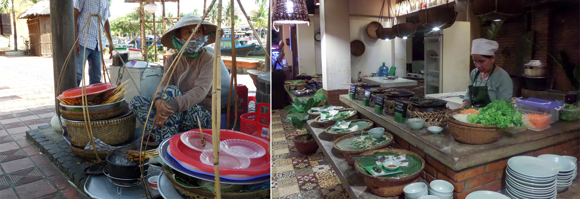 Food tours and cooking classes are popping up everywhere.Not everyone is as comfortable as I am trying street food though. (Sugared soybeans over ice with some black algae cubes, anyone?) Catering to tourists who want to try a wide variety of local specialties, Hoi An’s premier restaurateur opened Ms.Vy’s Market and Cooking School. She says, “My idea was to provide an interactive experience where customers could gain a better understanding of the cooking culture in Vietnam. Everything here is made fresh to order — just like in the actual real market — except here our guests can really see how the ingredients and dishes are prepared.” I would add that in her establishment, guests also eat without fear of foodborne illness (not that I’ve ever gotten sick, and I’ve eaten a lot of street food). What I was really struck with was how much the Market looked like one of our cafés, with stations for soups and noodles, wraps, barbecued meats, and more — except we don’t have a station called “weird wonderful food” serving silkworm salad or guava leaf–wrapped pig ear.